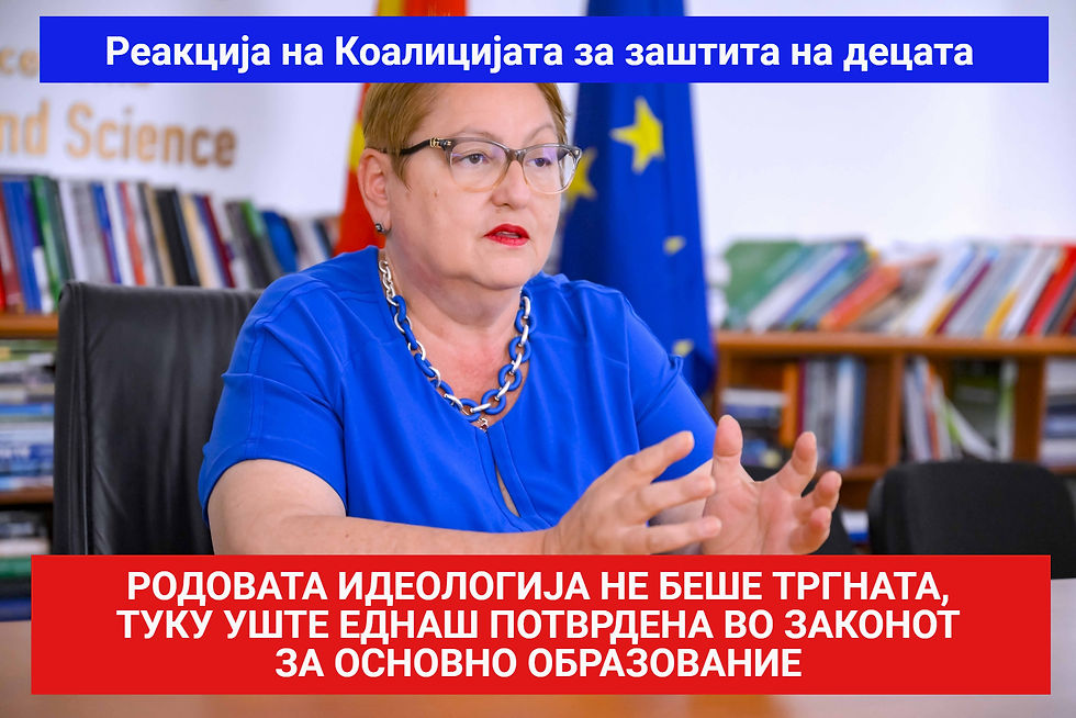 Коалицијата за заштита на децата изразува длабоко разочарување поради привидните промени во Законот за основно образование, со што практично не се поставуваат никакви бариери за заштита на децата од родовата идеологија и се создава простор за појава на енормни проблеми. Имено, иако минатата година Коалицијата и партнерите се одзваа на повикот на Министерството за образование и наука, и голем број народ го кажа својот став по однос на тоа какви измени треба да се направат на Законот за основно образование, и иако читавме храбри изјави од министерката Весна Јаневска дека наводно родовиот иденетитет ќе биде сосема тргнат од самиот закон, сега е веќе евидентно дека она што ни беше медиумски пласирано е далеку од вистината.